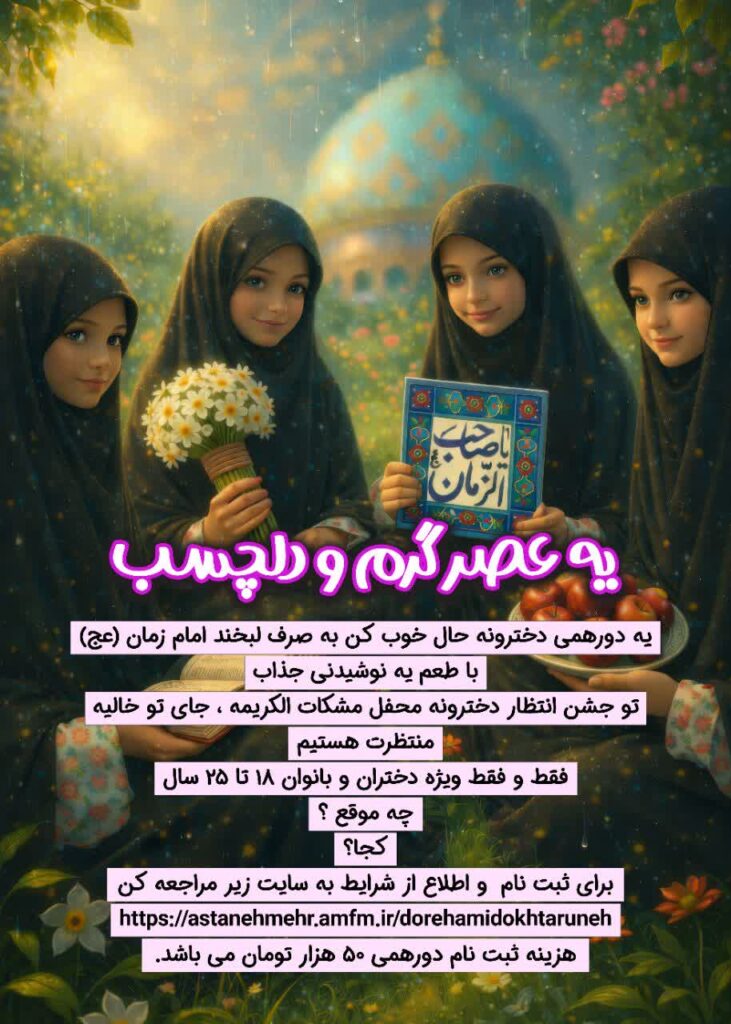 محفل مشکات الکریمه ۱۵ بهمن به مناسبت ولادت امام زمان علیه السلامدر کافه نیلوفرانه راس ساعت ۱۵ تا ۱۷:۳۰ برگزار خواهد شد .هزینه ثبت نام ۵۰ هزار تومان می باشدآدرس کافه نرسیده به سه راه سالاریه می باشد ثبت نام فقط و فقط برای دختران و بانوان ۱۸ تا ۲۵ سال می باشد و آیدیKhademkarimeh@ پاسخگویی است